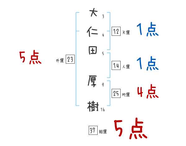 総運![]() | 大仁田厚樹さんの総運は37画の5つ星!努力家で順応性に優れる。現実的な考え方ができ忠実に物事をこなす。 あなたの人生を表す1番重要な運勢です。生涯を通じて影響する総合運となり、主に50歳以降の晩年期に影響を及ぼします。 |