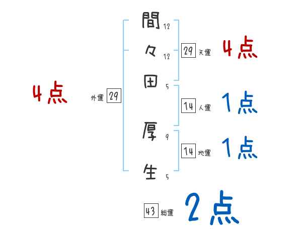 天運![]() | 間々田厚生さんの天運は29画の4つ星!完全主義で才能がある。厳格な心の持ち主。 家系が持つ宿命的な運勢を表します。祖先から受け継いだ苗字ですので自分の力が及びません。家柄を象徴します。 |