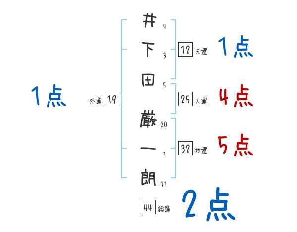総運![]() | 井下田厳一朗さんの総運は44画の2つ星!誠実で慎重な性格。物事を考えすぎないように注意しましょう。 あなたの人生を表す1番重要な運勢です。生涯を通じて影響する総合運となり、主に50歳以降の晩年期に影響を及ぼします。 |