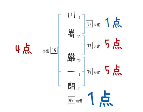 地運![]() | 川嵜厳一朗さんの地運は32画の5つ星!柔軟性があり成功する。チャンスが多く金運が良い。 個性を表す基礎的な運勢です。性格形成や対人関係、行動力など家庭環境に影響されます。主に誕生してから20歳くらいまでの若年期の運勢を表します。 |