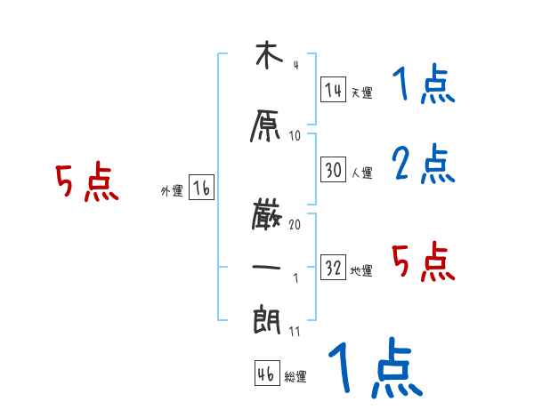 外運![]() | 木原厳一朗さんの外運は16画の5つ星!人望が厚く大きく発展する。逆転成功が見える。 生活面を象徴する運勢です。外部から受ける影響力を表し、結婚運、家庭運や職場、環境への順応性を表します。 |