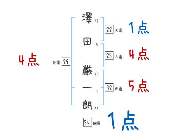 外運![]() | 澤田厳一朗さんの外運は29画の4つ星!完全主義で才能がある。厳格な心の持ち主。 生活面を象徴する運勢です。外部から受ける影響力を表し、結婚運、家庭運や職場、環境への順応性を表します。 |