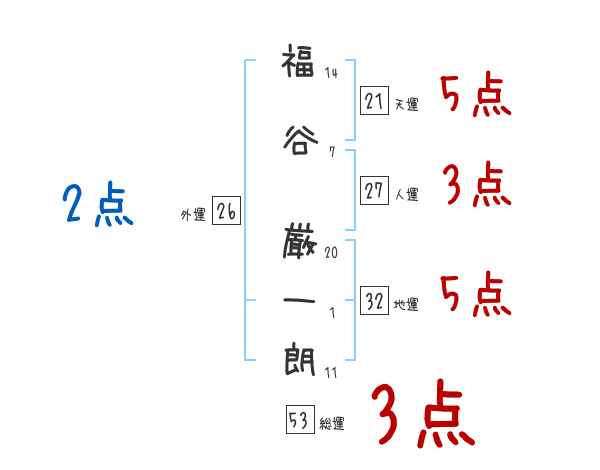 外運![]() | 福谷厳一朗さんの外運は26画の2つ星!波瀾万丈かも。信頼できる人を大事にしましょう。 生活面を象徴する運勢です。外部から受ける影響力を表し、結婚運、家庭運や職場、環境への順応性を表します。 |