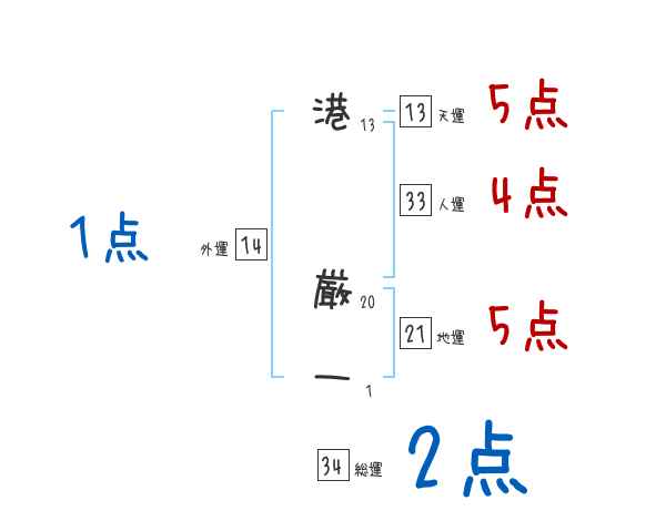 天運![]() | 港厳一さんの天運は13画の5つ星!才能に恵まれ人気がある。名声を手に入れる。円満な人生。 家系が持つ宿命的な運勢を表します。祖先から受け継いだ苗字ですので自分の力が及びません。家柄を象徴します。 |