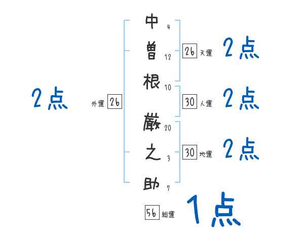天運![]() | 中曽根厳之助さんの天運は26画の2つ星!波瀾万丈かも。信頼できる人を大事にしましょう。 家系が持つ宿命的な運勢を表します。祖先から受け継いだ苗字ですので自分の力が及びません。家柄を象徴します。 |
