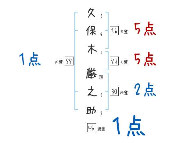 総運![]() | 久保木厳之助さんの総運は46画の1つ星!迷走することが多く苦労するかも。目先のことにとらわれないように。 あなたの人生を表す1番重要な運勢です。生涯を通じて影響する総合運となり、主に50歳以降の晩年期に影響を及ぼします。 |