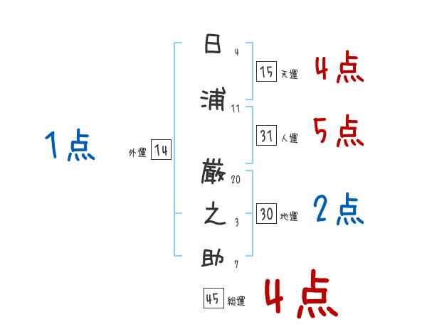 天運![]() | 日浦厳之助さんの天運は15画の4つ星!人徳があり出世する。順調に物事を進め円満な人生。 家系が持つ宿命的な運勢を表します。祖先から受け継いだ苗字ですので自分の力が及びません。家柄を象徴します。 |