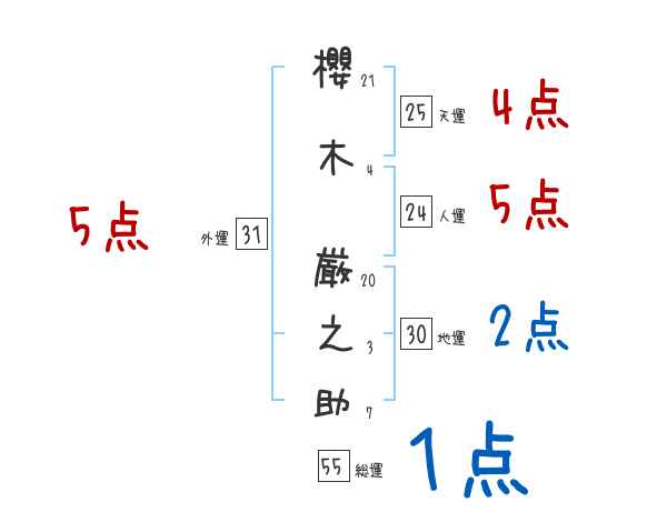 外運![]() | 櫻木厳之助さんの外運は31画の5つ星!社交性があり判断力に優れる。順風満帆な人生で円満な生活。 生活面を象徴する運勢です。外部から受ける影響力を表し、結婚運、家庭運や職場、環境への順応性を表します。 |