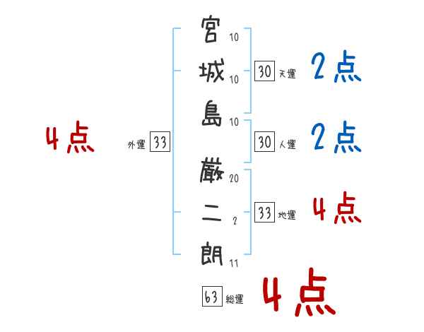 外運![]() | 宮城島厳二朗さんの外運は33画の4つ星!権力志向でプライドが高い。勇気があり運を切り開き成功する。 生活面を象徴する運勢です。外部から受ける影響力を表し、結婚運、家庭運や職場、環境への順応性を表します。 |