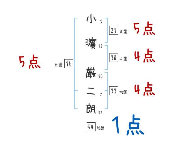 外運![]() | 小濵厳二朗さんの外運は16画の5つ星!人望が厚く大きく発展する。逆転成功が見える。 生活面を象徴する運勢です。外部から受ける影響力を表し、結婚運、家庭運や職場、環境への順応性を表します。 |