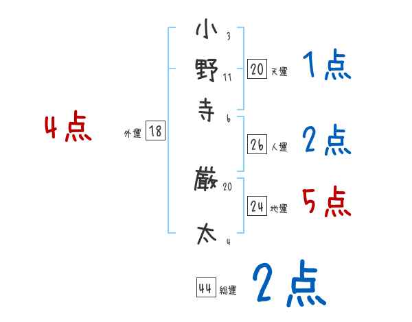 総運![]() | 小野寺厳太さんの総運は44画の2つ星!誠実で慎重な性格。物事を考えすぎないように注意しましょう。 あなたの人生を表す1番重要な運勢です。生涯を通じて影響する総合運となり、主に50歳以降の晩年期に影響を及ぼします。 |