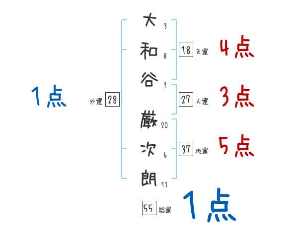 天運![]() | 大和谷厳次朗さんの天運は18画の4つ星!情熱的で剛気。忍耐力があり信頼される。 家系が持つ宿命的な運勢を表します。祖先から受け継いだ苗字ですので自分の力が及びません。家柄を象徴します。 |