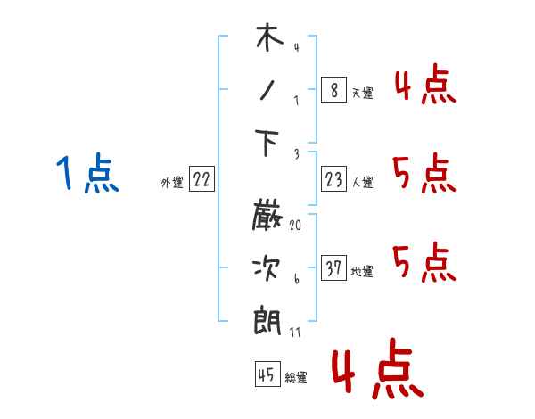 総運![]() | 木ノ下厳次朗さんの総運は45画の4つ星!もくもくと物事を進め達成する。地味な努力家。 あなたの人生を表す1番重要な運勢です。生涯を通じて影響する総合運となり、主に50歳以降の晩年期に影響を及ぼします。 |