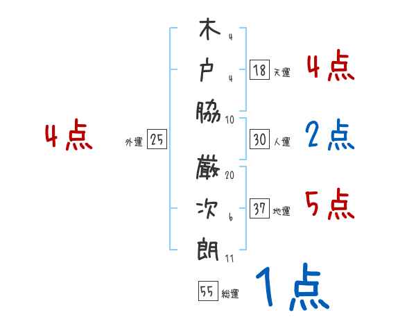 天運![]() | 木戸脇厳次朗さんの天運は18画の4つ星!情熱的で剛気。忍耐力があり信頼される。 家系が持つ宿命的な運勢を表します。祖先から受け継いだ苗字ですので自分の力が及びません。家柄を象徴します。 |