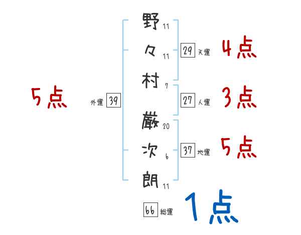 外運![]() | 野々村厳次朗さんの外運は39画の5つ星!社交性に優れ人望が厚い。人の上に立ち成功する。 生活面を象徴する運勢です。外部から受ける影響力を表し、結婚運、家庭運や職場、環境への順応性を表します。 |