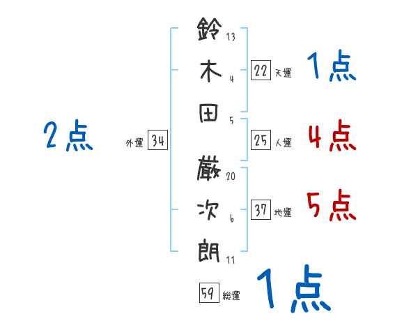 総運![]() | 鈴木田厳次朗さんの総運は59画の1つ星!意志の弱さであきらめることが多いかも。粘り強さが必要。 あなたの人生を表す1番重要な運勢です。生涯を通じて影響する総合運となり、主に50歳以降の晩年期に影響を及ぼします。 |