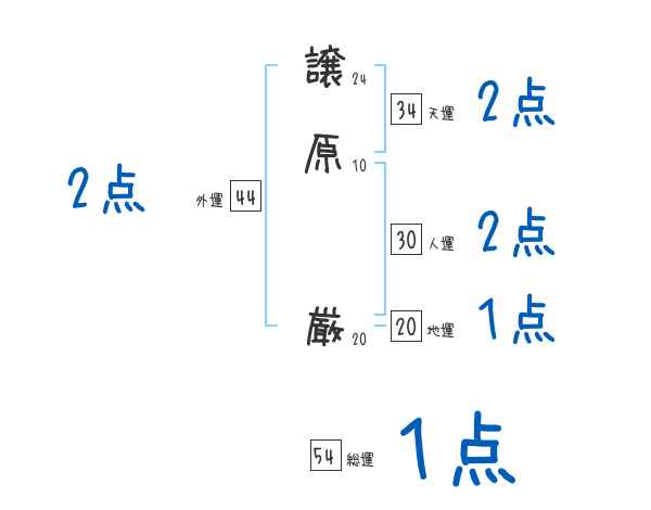 外運![]() | 譲原厳さんの外運は44画の2つ星!誠実で慎重な性格。物事を考えすぎないように注意しましょう。 生活面を象徴する運勢です。外部から受ける影響力を表し、結婚運、家庭運や職場、環境への順応性を表します。 |