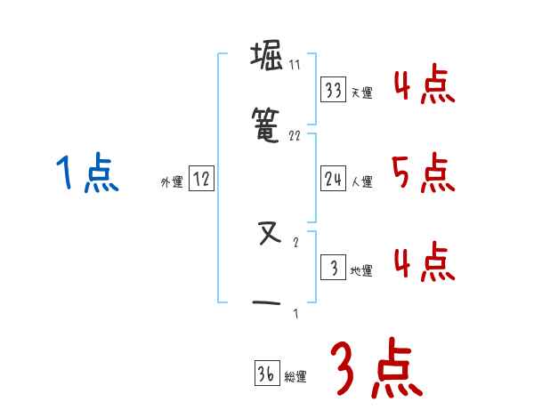 天運![]() | 堀篭又一さんの天運は33画の4つ星!権力志向でプライドが高い。勇気があり運を切り開き成功する。 家系が持つ宿命的な運勢を表します。祖先から受け継いだ苗字ですので自分の力が及びません。家柄を象徴します。 |