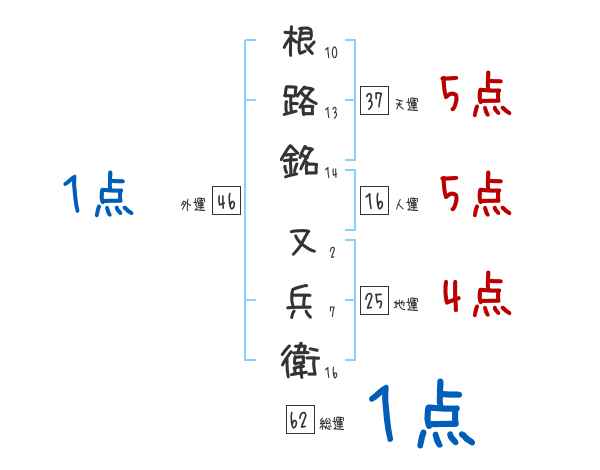 天運![]() | 根路銘又兵衛さんの天運は37画の5つ星!努力家で順応性に優れる。現実的な考え方ができ忠実に物事をこなす。 家系が持つ宿命的な運勢を表します。祖先から受け継いだ苗字ですので自分の力が及びません。家柄を象徴します。 |