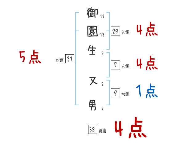 総運![]() | 御園生又男さんの総運は38画の4つ星!温厚な性格で技術的な才能を発揮する。職人的な仕事に向いている。 あなたの人生を表す1番重要な運勢です。生涯を通じて影響する総合運となり、主に50歳以降の晩年期に影響を及ぼします。 |