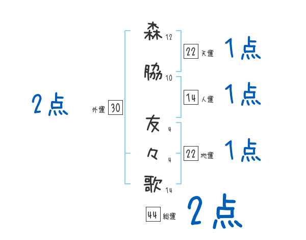 外運![]() | 森脇友々歌さんの外運は30画の2つ星!浮き沈みの激しさに注意しましょう。 生活面を象徴する運勢です。外部から受ける影響力を表し、結婚運、家庭運や職場、環境への順応性を表します。 |