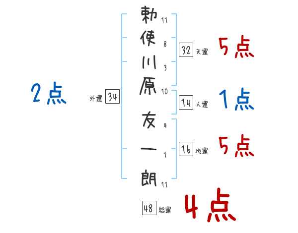 天運![]() | 勅使川原友一朗さんの天運は32画の5つ星!柔軟性があり成功する。チャンスが多く金運が良い。 家系が持つ宿命的な運勢を表します。祖先から受け継いだ苗字ですので自分の力が及びません。家柄を象徴します。 |