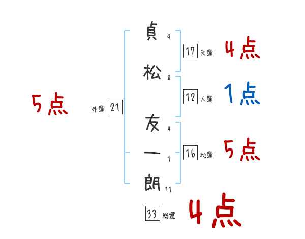 天運![]() | 貞松友一朗さんの天運は17画の4つ星!積極的な行動力。地位を気づき財産を手に入れる。純粋な心と直感力。 家系が持つ宿命的な運勢を表します。祖先から受け継いだ苗字ですので自分の力が及びません。家柄を象徴します。 |