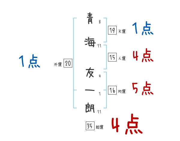 天運![]() | 青海友一朗さんの天運は19画の1つ星!優れた才能を持ちますが、協調性が足りないことも。周りの人と協力する事を意識しましょう。 家系が持つ宿命的な運勢を表します。祖先から受け継いだ苗字ですので自分の力が及びません。家柄を象徴します。 |