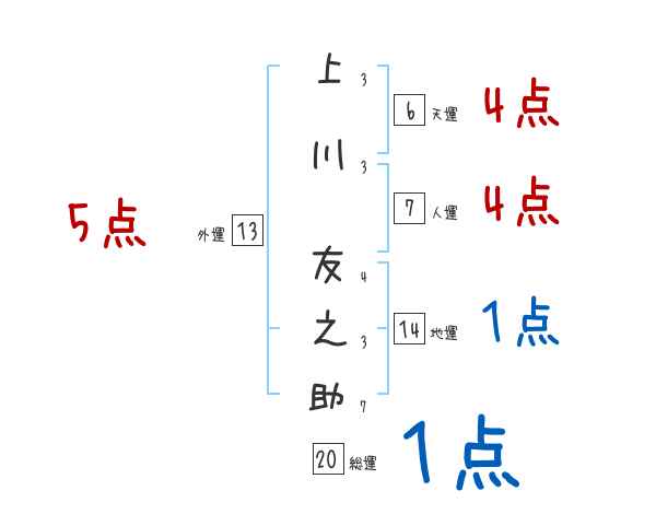 | 外運  | 上川友之助さんの外運は13画の5つ星!才能に恵まれ人気がある。名声を手に入れる。円満な人生。生活面を象徴する運勢です。外部から受ける影響力を表し、結婚運、家庭運や職場、環境への順応性を表します。 |