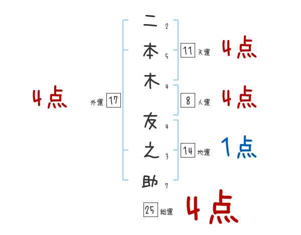 外運![]() | 二本木友之助さんの外運は17画の4つ星!積極的な行動力。地位を気づき財産を手に入れる。純粋な心と直感力。 生活面を象徴する運勢です。外部から受ける影響力を表し、結婚運、家庭運や職場、環境への順応性を表します。 |