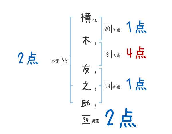 総運![]() | 横木友之助さんの総運は34画の2つ星!独創性に優れるが、自尊心が強く災難に注意しましょう。 あなたの人生を表す1番重要な運勢です。生涯を通じて影響する総合運となり、主に50歳以降の晩年期に影響を及ぼします。 |