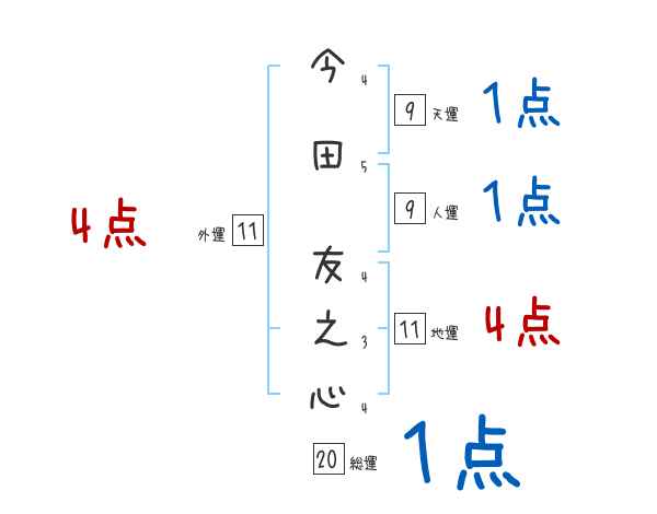 人運![]() | 今田友之心さんの人運は9画の1つ星!消極的で才能を発揮することが苦手なことも。周りの意見に耳を傾けましょう。 性格や才能などを表す2番目に重要な運勢です。人間関係や協調性、社会的な成功に影響します。主に20歳から50歳ぐらいまでの中年期の運勢を表します。 |