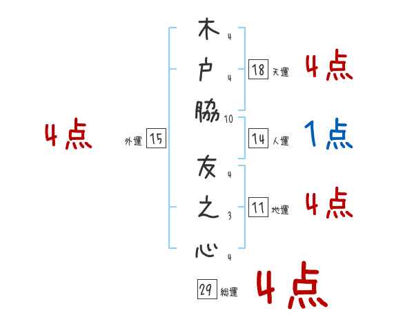総運![]() | 木戸脇友之心さんの総運は29画の4つ星!完全主義で才能がある。厳格な心の持ち主。 あなたの人生を表す1番重要な運勢です。生涯を通じて影響する総合運となり、主に50歳以降の晩年期に影響を及ぼします。 |