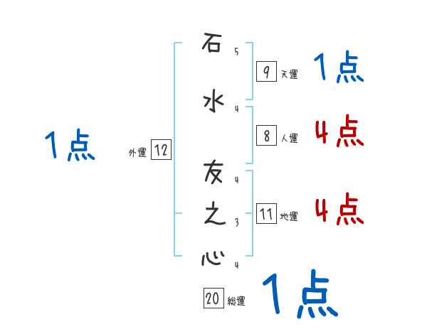 天運![]() | 石水友之心さんの天運は9画の1つ星!消極的で才能を発揮することが苦手なことも。周りの意見に耳を傾けましょう。 家系が持つ宿命的な運勢を表します。祖先から受け継いだ苗字ですので自分の力が及びません。家柄を象徴します。 |