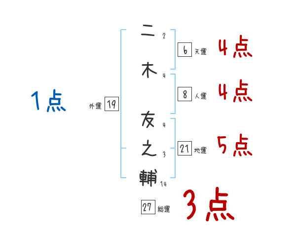 外運![]() | 二木友之輔さんの外運は19画の1つ星!優れた才能を持ちますが、協調性が足りないことも。周りの人と協力する事を意識しましょう。 生活面を象徴する運勢です。外部から受ける影響力を表し、結婚運、家庭運や職場、環境への順応性を表します。 |