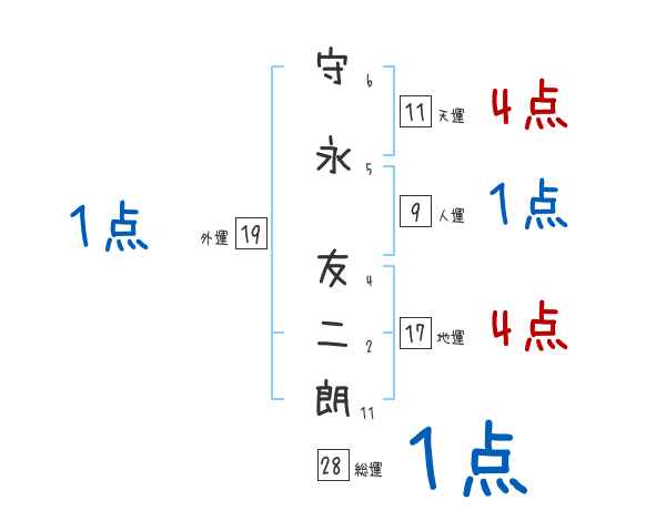 総運![]() | 守永友二朗さんの総運は28画の1つ星!家庭環境に注意。スポーツで活躍できる能力があるかも。 あなたの人生を表す1番重要な運勢です。生涯を通じて影響する総合運となり、主に50歳以降の晩年期に影響を及ぼします。 |