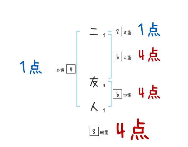 天運![]() | 二友人さんの天運は2画の1つ星!優しいですが積極性や意思の強さに欠ける傾向があります。家庭環境の乱れに注意しましょう。 家系が持つ宿命的な運勢を表します。祖先から受け継いだ苗字ですので自分の力が及びません。家柄を象徴します。 |