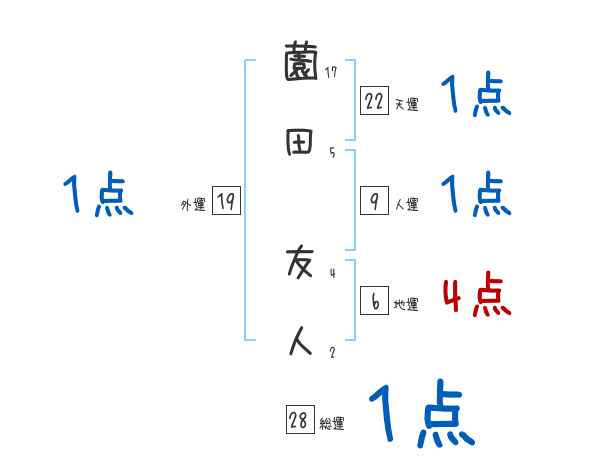天運![]() | 薗田友人さんの天運は22画の1つ星!努力することが苦手ないっぽう手先が器用。芸術性にも優れる。 家系が持つ宿命的な運勢を表します。祖先から受け継いだ苗字ですので自分の力が及びません。家柄を象徴します。 |
