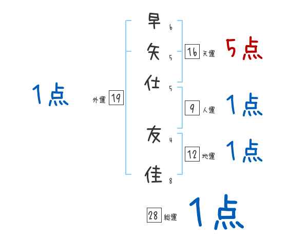 総運![]() | 早矢仕友佳さんの総運は28画の1つ星!家庭環境に注意。スポーツで活躍できる能力があるかも。 あなたの人生を表す1番重要な運勢です。生涯を通じて影響する総合運となり、主に50歳以降の晩年期に影響を及ぼします。 |