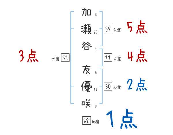 外運![]() | 加瀬谷友優咲さんの外運は51画の3つ星!変化が激しく、危険に注意。堅実な性格。 生活面を象徴する運勢です。外部から受ける影響力を表し、結婚運、家庭運や職場、環境への順応性を表します。 |