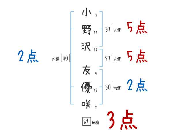 総運![]() | 小野沢友優咲さんの総運は61画の3つ星!強情な性格でうぬぼれタイプ。自ら破滅する。 あなたの人生を表す1番重要な運勢です。生涯を通じて影響する総合運となり、主に50歳以降の晩年期に影響を及ぼします。 |