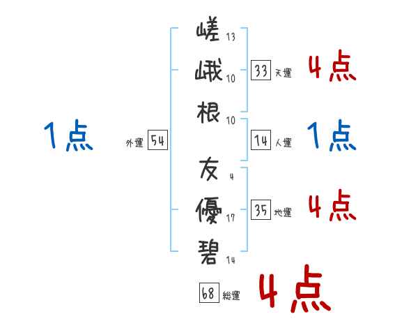総運![]() | 嵯峨根友優碧さんの総運は68画の4つ星!潜在能力が高く集中力が高い。勤勉に励み発展する。 あなたの人生を表す1番重要な運勢です。生涯を通じて影響する総合運となり、主に50歳以降の晩年期に影響を及ぼします。 |