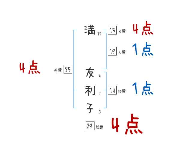 総運![]() | 満友利子さんの総運は29画の4つ星!完全主義で才能がある。厳格な心の持ち主。 あなたの人生を表す1番重要な運勢です。生涯を通じて影響する総合運となり、主に50歳以降の晩年期に影響を及ぼします。 |