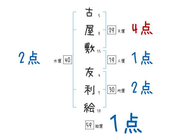 外運![]() | 古屋敷友利絵さんの外運は40画の2つ星!自信過剰で物事に固執するためトラブルに注意。 生活面を象徴する運勢です。外部から受ける影響力を表し、結婚運、家庭運や職場、環境への順応性を表します。 |