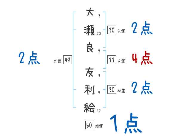 天運![]() | 大瀬良友利絵さんの天運は30画の2つ星!浮き沈みの激しさに注意しましょう。 家系が持つ宿命的な運勢を表します。祖先から受け継いだ苗字ですので自分の力が及びません。家柄を象徴します。 |