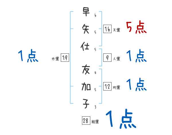 総運![]() | 早矢仕友加子さんの総運は28画の1つ星!家庭環境に注意。スポーツで活躍できる能力があるかも。 あなたの人生を表す1番重要な運勢です。生涯を通じて影響する総合運となり、主に50歳以降の晩年期に影響を及ぼします。 |