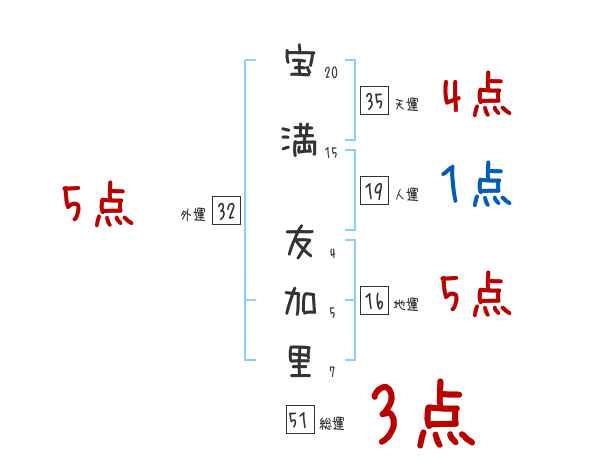 天運![]() | 宝満友加里さんの天運は35画の4つ星!温厚な性格で感受性が高い。穏和な性格で人望が厚い。 家系が持つ宿命的な運勢を表します。祖先から受け継いだ苗字ですので自分の力が及びません。家柄を象徴します。 |