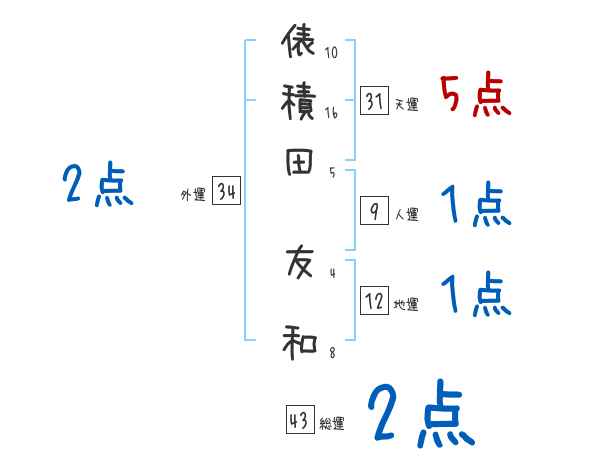 総運![]() | 俵積田友和さんの総運は43画の2つ星!頑固な性格で独立心が強いかも。やや非現実的で浪費に注意しましょう。 あなたの人生を表す1番重要な運勢です。生涯を通じて影響する総合運となり、主に50歳以降の晩年期に影響を及ぼします。 |