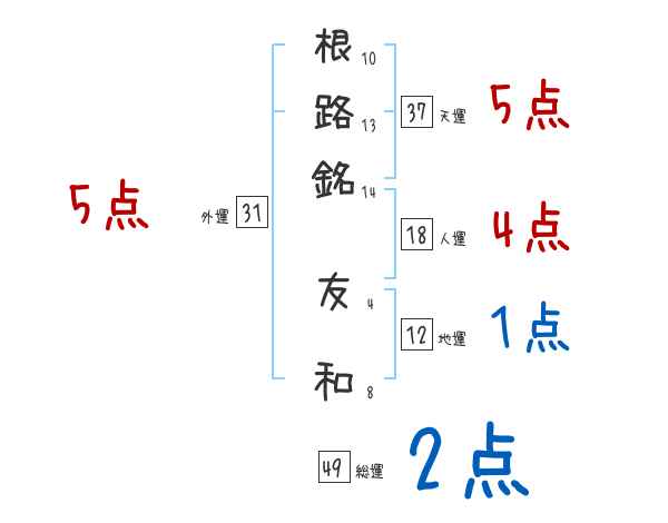 天運![]() | 根路銘友和さんの天運は37画の5つ星!努力家で順応性に優れる。現実的な考え方ができ忠実に物事をこなす。 家系が持つ宿命的な運勢を表します。祖先から受け継いだ苗字ですので自分の力が及びません。家柄を象徴します。 |
