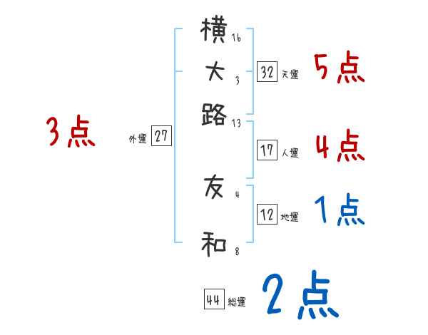 天運![]() | 横大路友和さんの天運は32画の5つ星!柔軟性があり成功する。チャンスが多く金運が良い。 家系が持つ宿命的な運勢を表します。祖先から受け継いだ苗字ですので自分の力が及びません。家柄を象徴します。 |